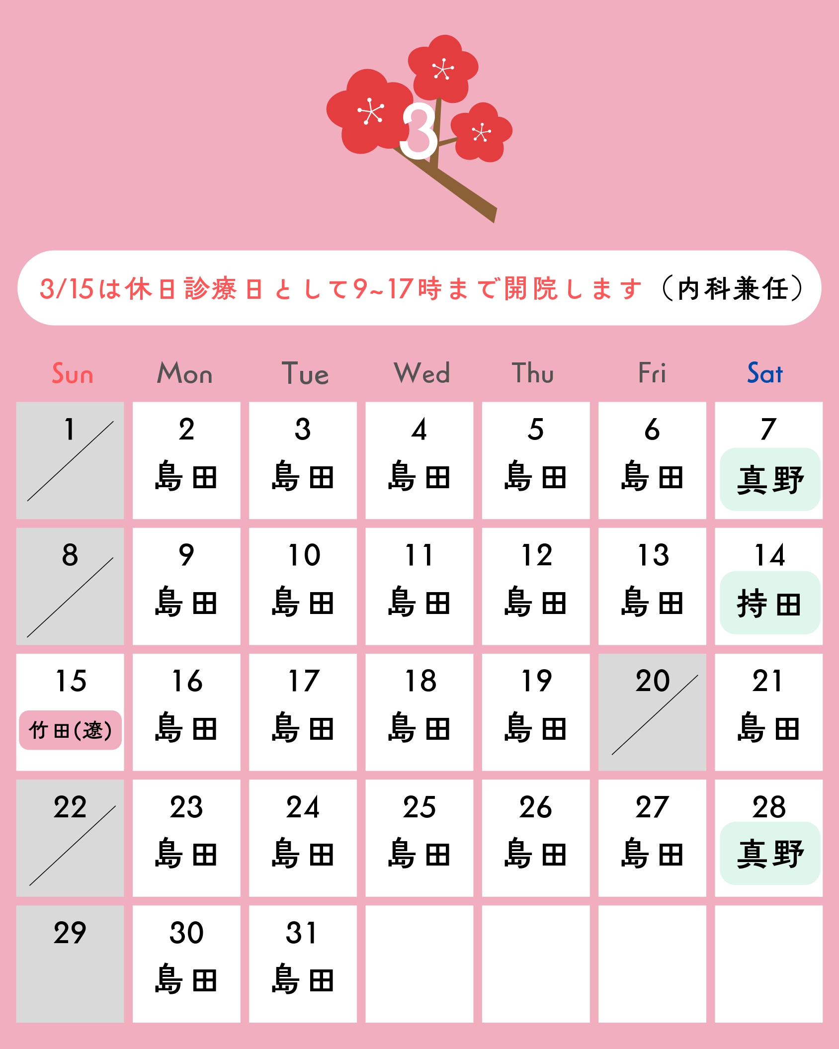 ★:予防接種・健診のみ ■:土曜日のみ14:00〜14:30