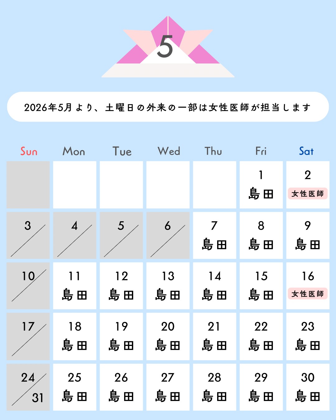 ★:予防接種・健診のみ ■:土曜日のみ14:00〜14:30
