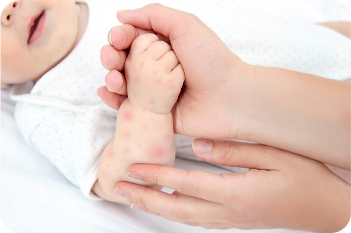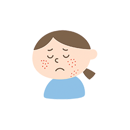 39℃近い高熱が3~4日間続き、その後、解熱とともに発疹が現れる疾患です。発疹により機嫌が悪くなることもあるため、状況に応じた対応が必要です。